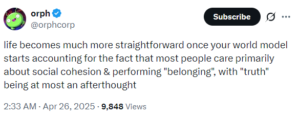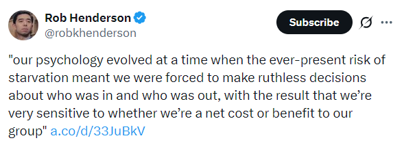 I’ve tried to present this theory as clearly as I can, without references to academic work or empirical research. Partly because I think the theory is intuitive on its own, and partly because I’m not an empirical social scientist. Empirical social science is difficult to do well and easy to do badly, and attempting to provide empirical support would have been disingenuous — adding only a thin veneer of epistemic authority.