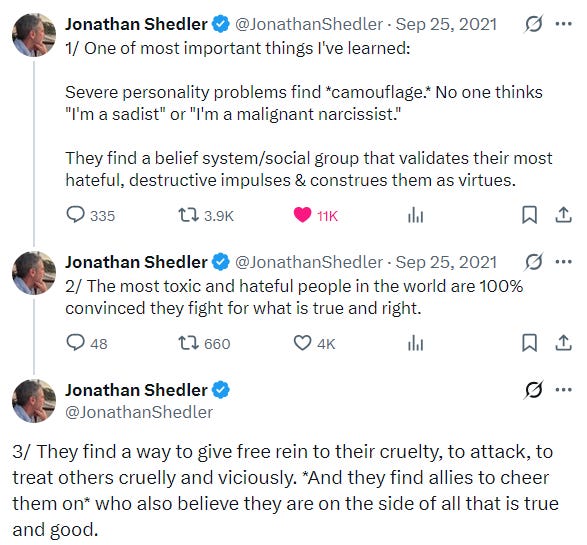 Examples include: narcissism (I’m better than other people), victim mentality (everything is working against me), externalizing blame (my problems are caused by others or society), defensive self-sufficiency (I don’t need anyone), moral superiority (I’m more virtuous than others).
