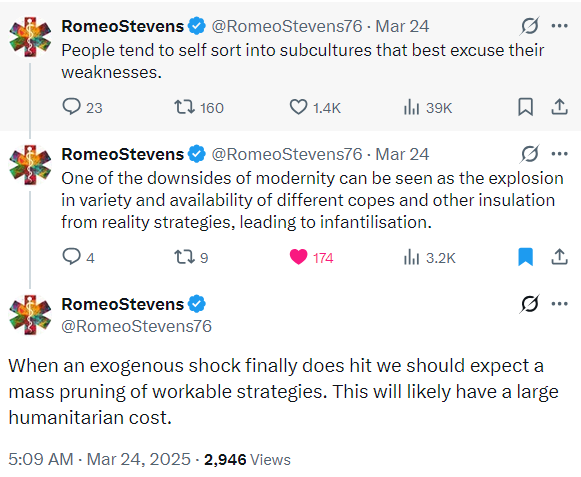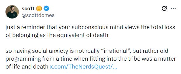 This intuitive part of me thinks everything hangs together nicely, it fits with established theories of psychology, it’s a plausible mechanism and it matches my own personal experience. It explains a connection between low self-worth and common defence mechanisms, the connection between loneliness and ideological extremism, and why self-worth is so important to mental health. The intuitive part of me thinks this theory is parsimonious and has explanatory power. There’s probably a lot of variation in how strongly people are affected by it, and this is influenced by genetics, but the aggregate effect across society could be significant. It might even explain what is driving political polarization, the mental health crisis, and whatever the hell is going on with gender relations these days.