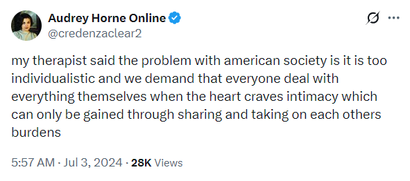 In modern environments, our basic needs are met through impersonal systems (markets, institutions, infrastructure) and we are less dependent on specific individuals for survival. This, among other factors, has led to increasing social atomization.